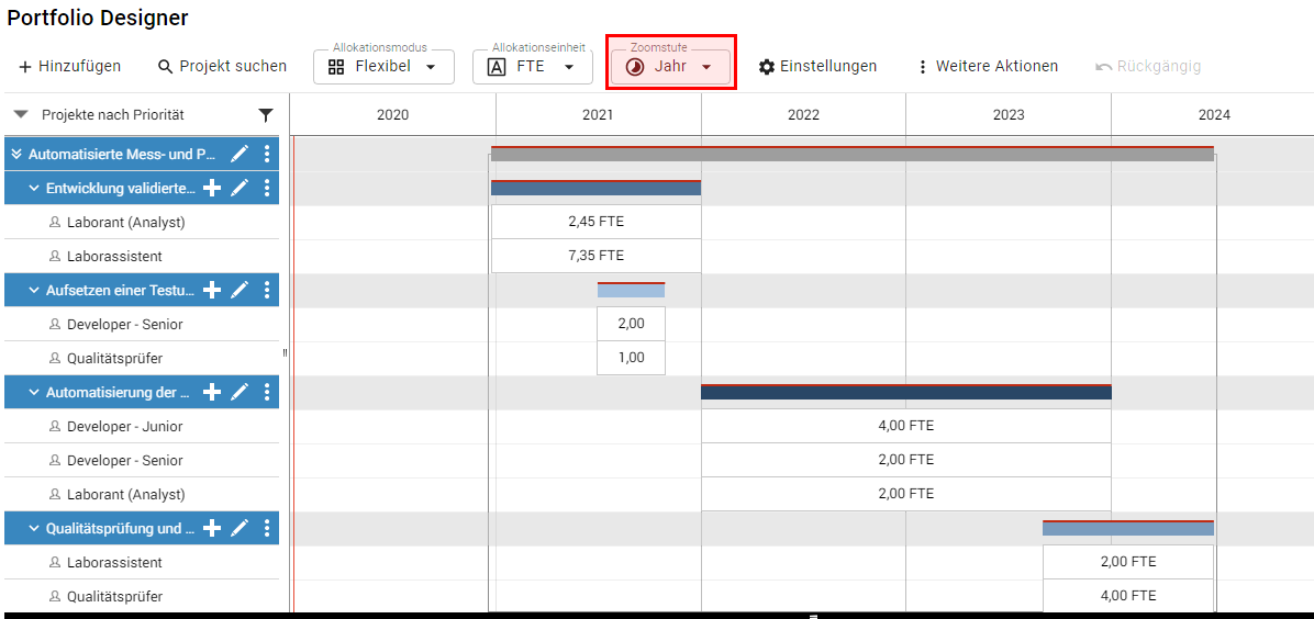 Bitte beachten Sie: (Über)Allokationen und Kapazitäten werden nicht angezeigt, wenn sich der Datumsbereich mehr als zwei Jahre in die Vergangenheit und mehr als drei Jahre in die Zukunft erstreckt. Wechseln Sie zu einer höheren Zoomstufe, um mehr Allokations- und Kapazitätswerte zu sehen.