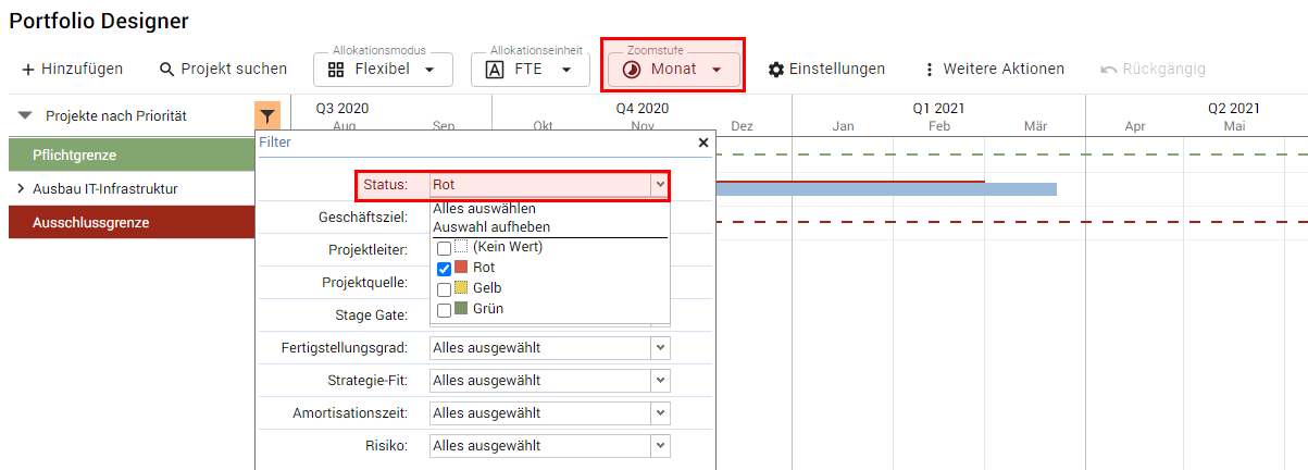 Sie prüfen regelmäßig Ihre laufenden Projekte in einem Statustermin. Dabei möchten Sie insbesondere Projekte mit einem kritischen Status betrachten, um zu entscheiden, ob Sie eingreifen müssen:
