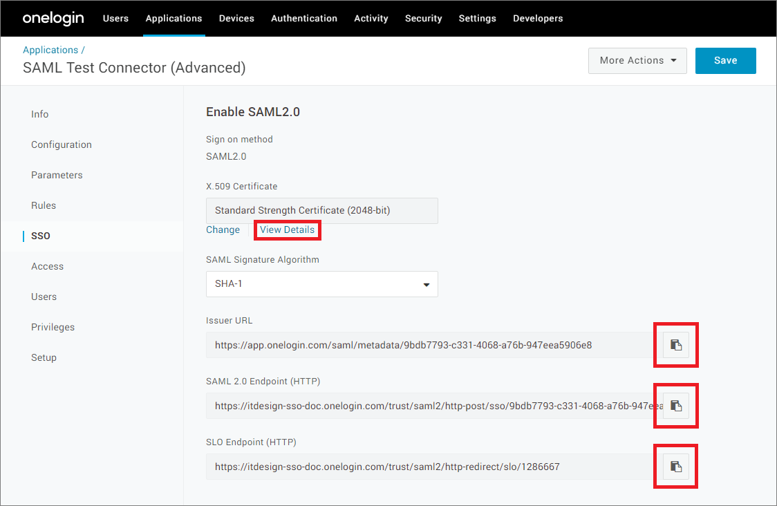 - Wechseln Sie in OneLogin zum Reiter SSO. Kopieren Sie das X.509 Certificate (Anzeige durch Klick auf View Details) und die Werte für Issuer URL, SAML 2.0 Endpoint (HTTP) sowie SLO Endpoint (HTTP).