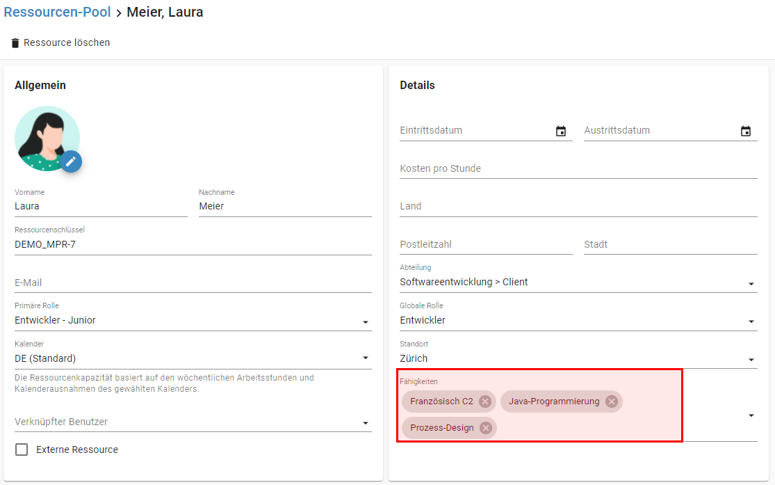 Klicken Sie in der linken Seitenleiste auf Ressourcen-Pool und öffnen Sie die Ressourcenübersicht. Wählen Sie dann eine Ressource aus und öffnen Sie im Abschnitt Details das Dropdown mit den Fähigkeiten: