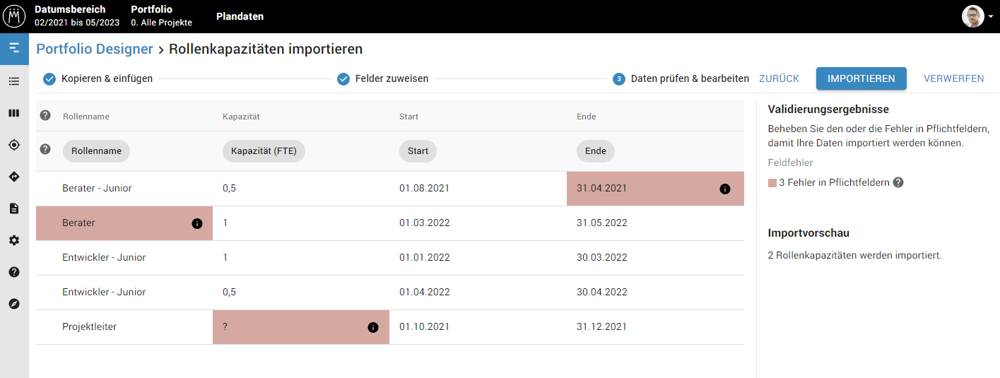 Wenn Sie alle Fehler korrigiert haben, klicken Sie auf Importieren, damit Ihre Kapazitäten in Meisterplan verfügbar sind.