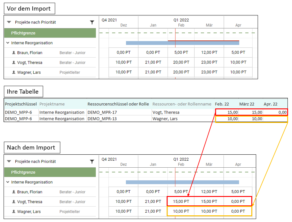 Die Allokationen von "Vogt, Theresa" (rote Markierung) und von "Wagner, Lars" (gelbe Markierung) wurden nur für der Zeitraum aus der Tabelle aktualisiert, die Allokationen für die Monate Dezember und Januar bleiben unverändert. Bei "Wagner, Lars" ist das Feld für April in der Tabelle leer, also wurde der bestehende Wert mit "0 PT" überschrieben.