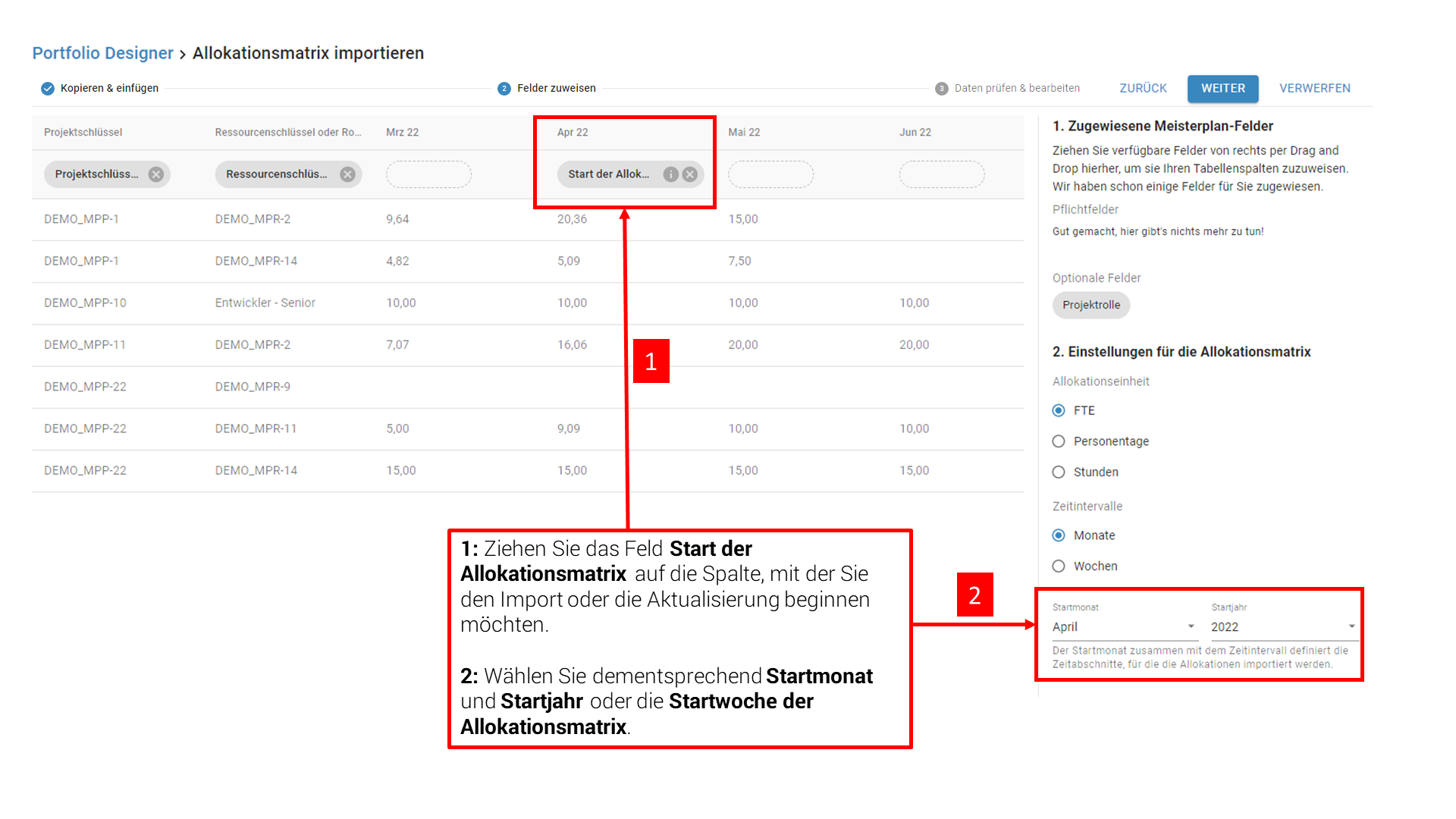 Start der Allokationsmatrix: Ziehen Sie dieses Feld zu der Spalte mit dem ersten Allokationsintervall, das Sie importieren möchten;