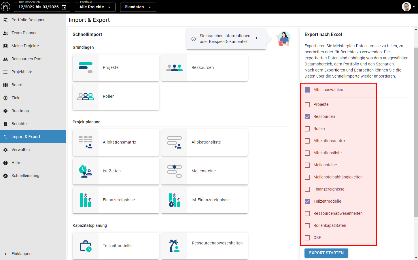 - Laden Sie die Daten aus dem Abschnitt Teilzeitmodell herunter, indem Sie in der linken Seitenleiste auf Import & Export klicken und unter Export nach Excel einen Haken bei Teilzeitmodelle und Ressourcen setzen. Klicken Sie dann auf Export starten.