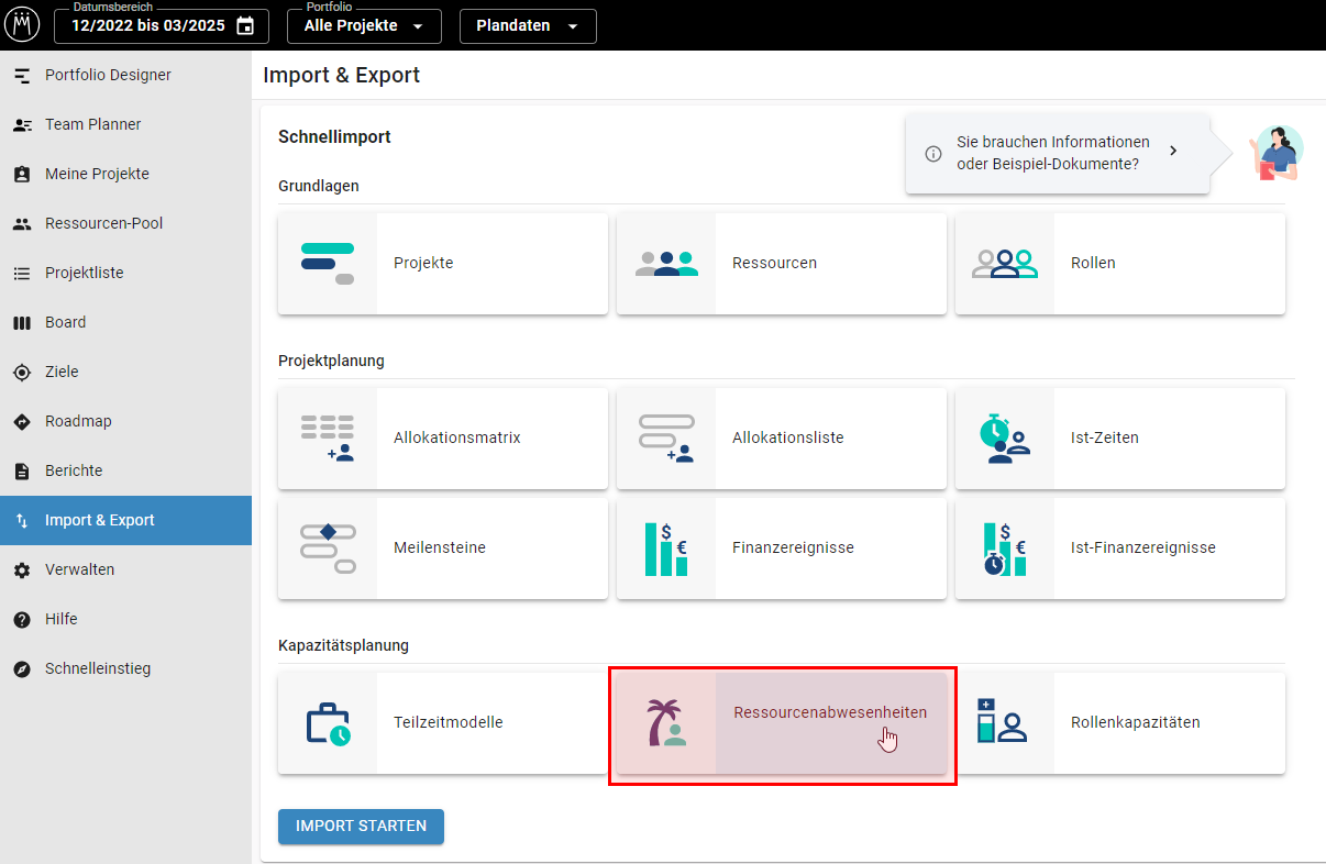 - Importieren Sie dann die Abwesenheiten über den aktualisierten Schnellimport für Ressourcenabwesenheiten.