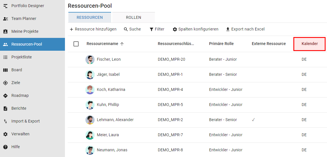 Wenn Sie Teilzeitkalender löschen und stattdessen den Standardkalender hinterlegen, kann das bereits hinterlegte Kapazitätsänderungen beeinflussen. Damit Sie den aktuellen Stand Ihrer Daten jederzeit wiederherstellen können, empfehlen wir zur Sicherheit, dass Sie die Daten aus den Abschnitten Teilzeitmodell und Allgemein der Ressourcendetails exportieren. Damit haben Sie eine vollständige Übersicht aller Kapazitätsänderungen sowie den Kalender, auf dem sie basieren, bevor Sie die Kalender aktualisieren.