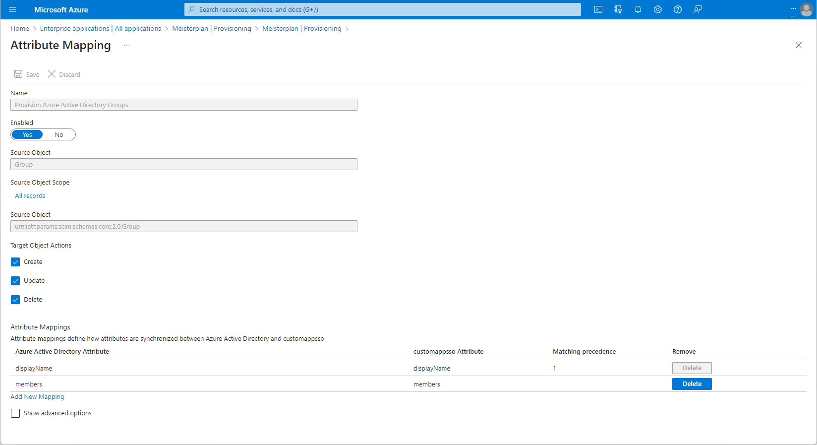 - Ordnen Sie die Entra-Attribute für einzelne Benutzer den Meisterplan-Attributen zu. userPrincipalName und mail sind Pflicht-Mappings (Pflichtzuordnungen):