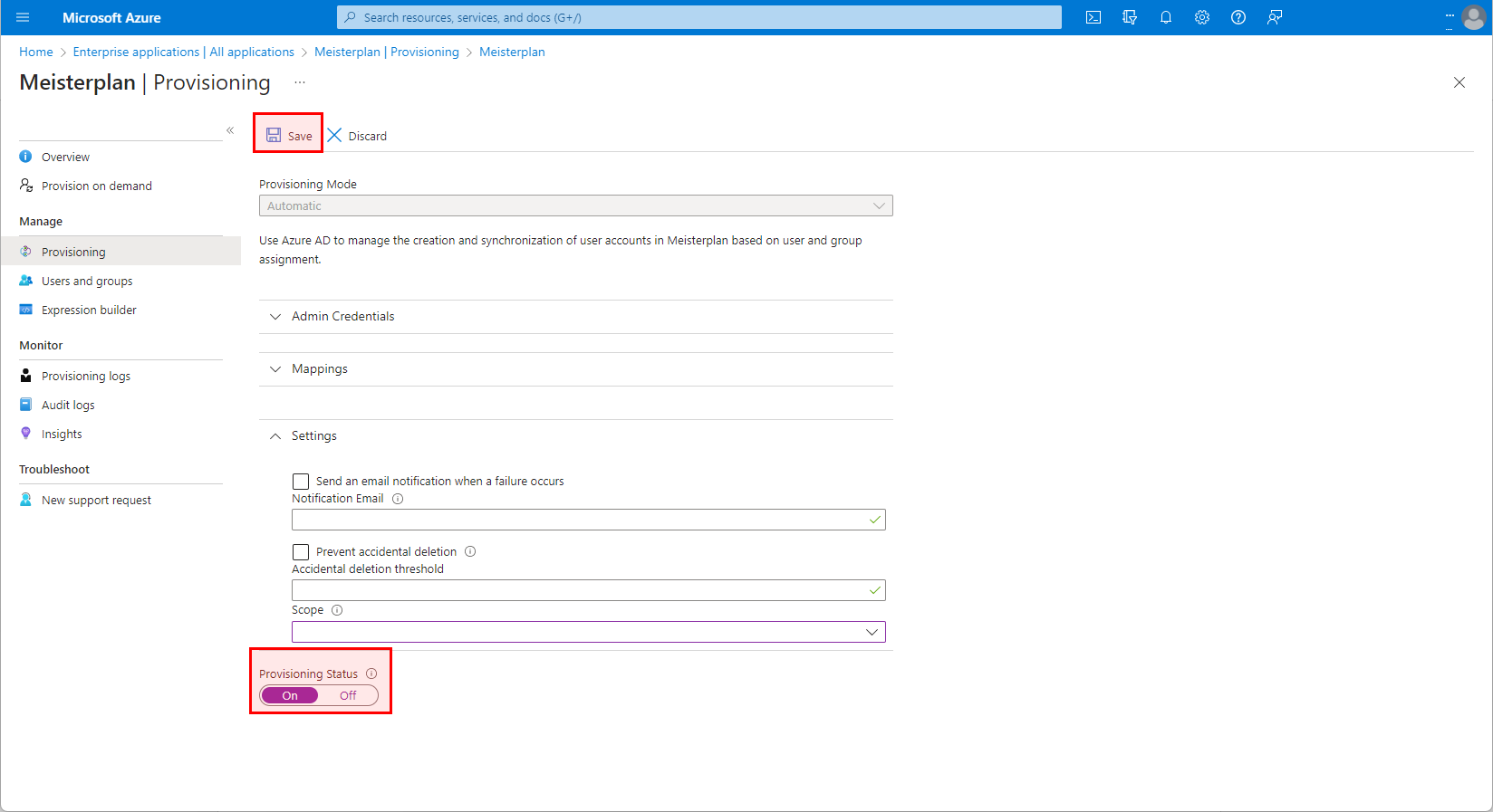 - Setzen Sie den Provisioning Status (Status der Autoprovisionierung) auf On (an) und klicken Sie oben auf Save (Speichern).