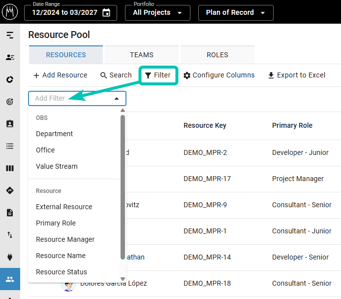 - Portfolio: If the selected portfolio includes a resource filter (for example, by OBS or primary role), the list will only display resources that are included by the filter. Learn more in the Portfolio Filters - Details article.