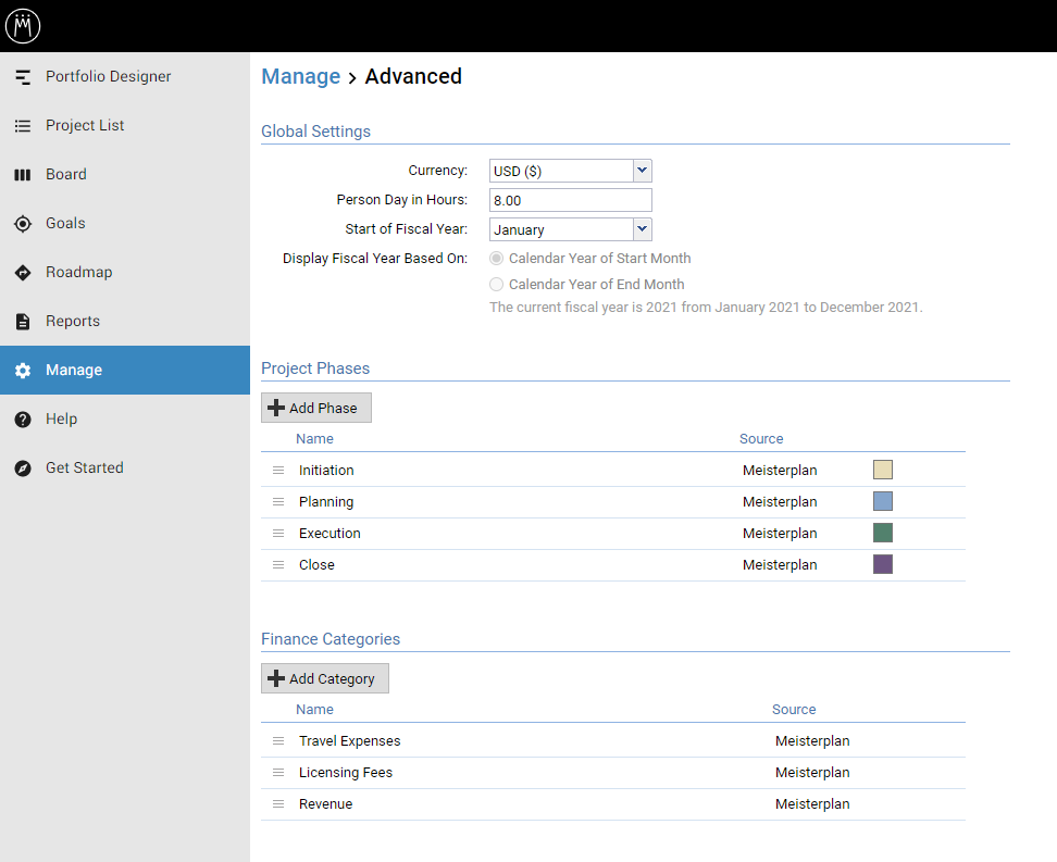Use this view to configure system-wide settings such as currency, project phases or finance categories. In the left Sidebar, click Manage and select Advanced: