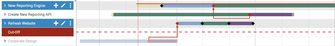 - If the first milestone in the dependency is below the Cut-Off Line. For example, your team does not have capacity to take on a corporate design project. This project is a requirement for a website refresh project and therefore, your team cannot progress with either project.