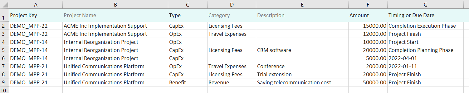 To import planned financial events, the project keys in your spreadsheet and (if relevant) existing milestone names need to match exactly the project keys and milestone names in Meisterplan. This means that each of the milestones should exist only once per project in the relevant scenario in Meisterplan.