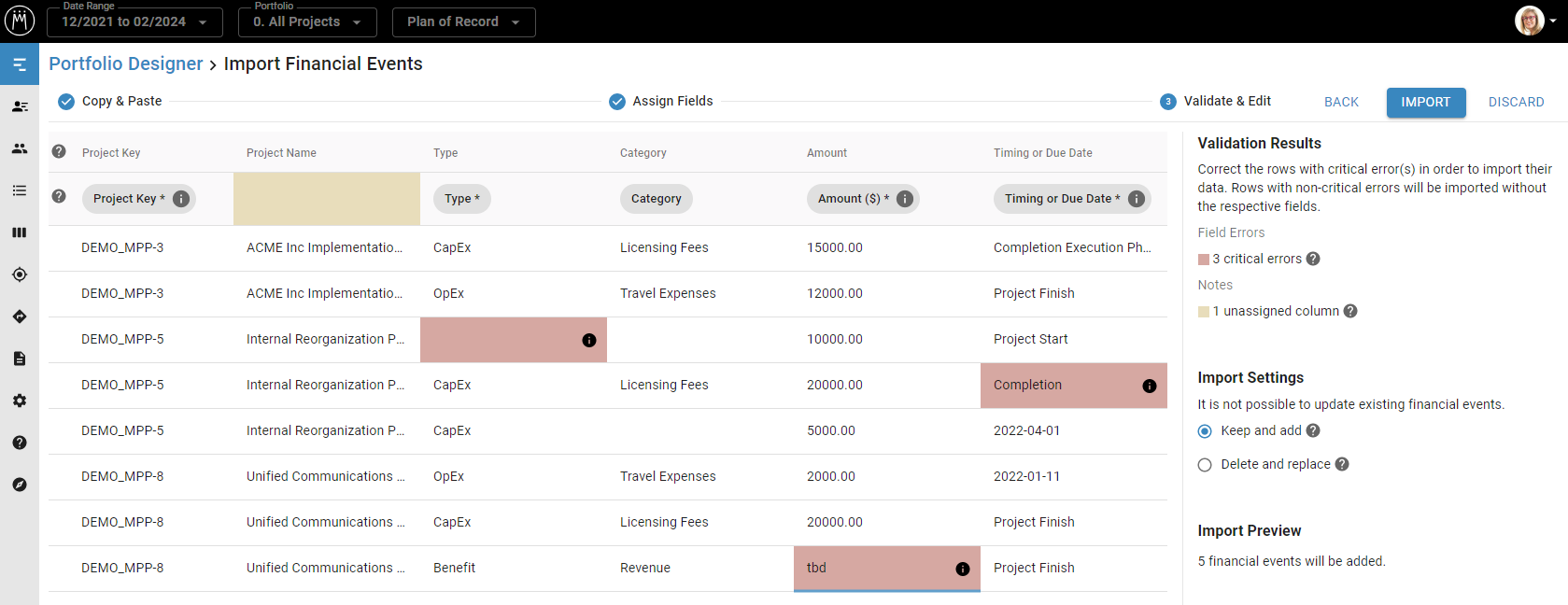 In this step, you can validate and edit your planned financial events before import. Simply edit the highlighted field by clicking on it. Fields highlighted in dark red indicate an error that will prevent the complete line (i.e., the planned financial event) from being imported. Fields highlighted in light red indicate an error that will prevent the field from being imported, but not the rest of the line.