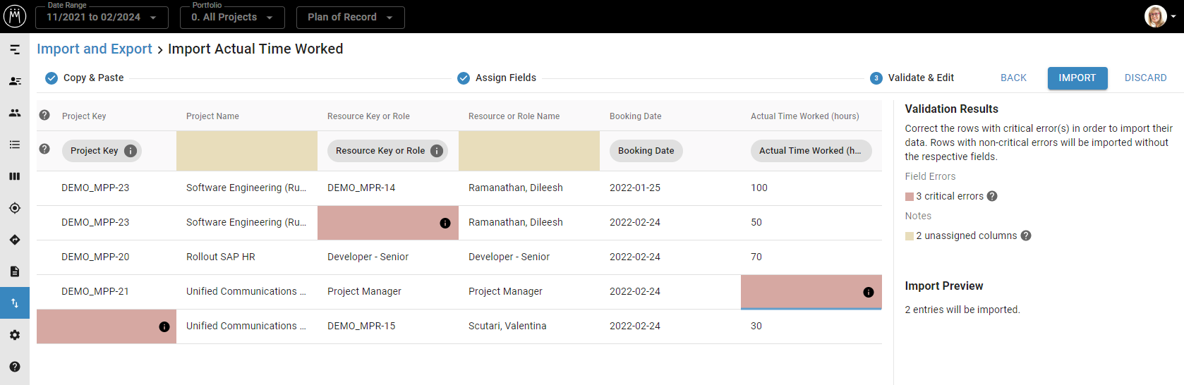 In this step, you can validate and edit your Actual Time Worked before import. Simply edit the highlighted field by clicking on it. Fields highlighted in dark red indicate an error that will prevent the complete line (i.e., the booking date) from being imported.